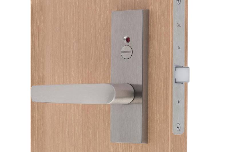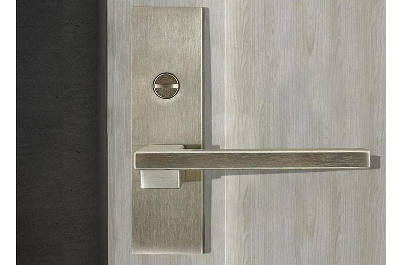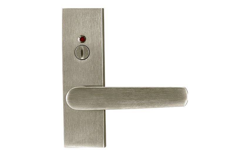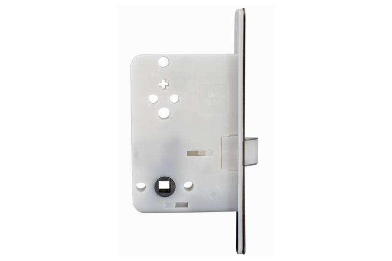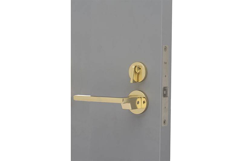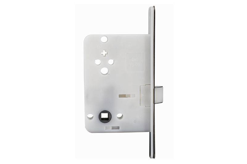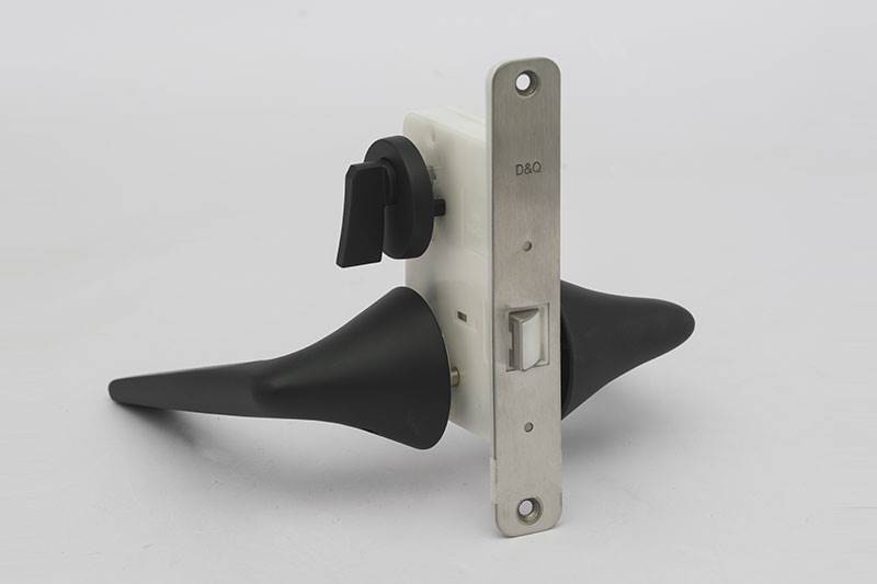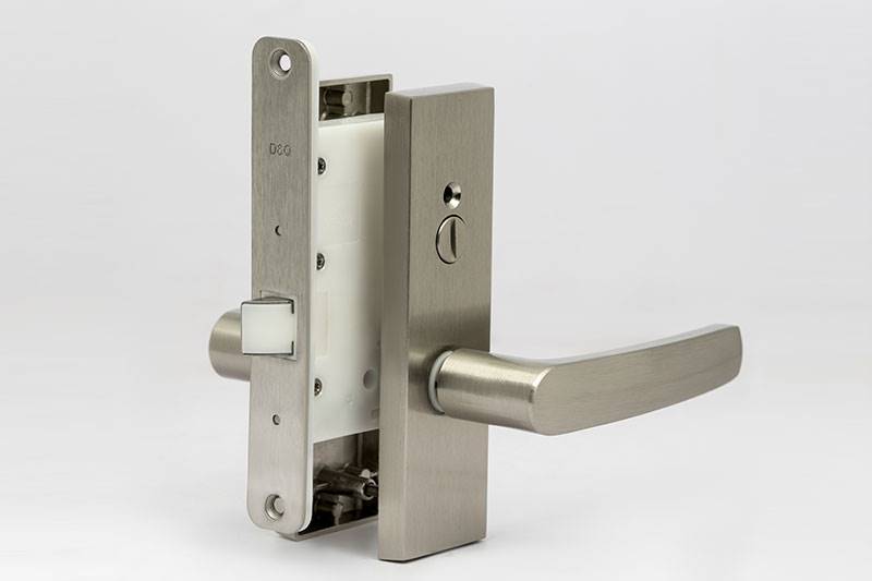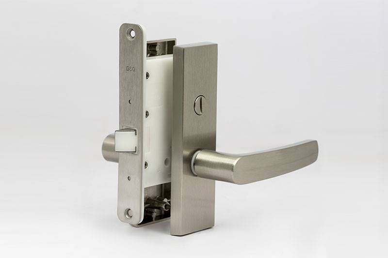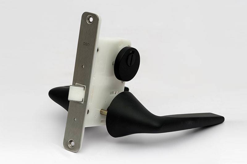 - Замок врезной сувальдный с поворотной ручкой выполнен без отверстия для ключа. Дверь можно запереть внутренней ручкой и открыть снаружи с помощью жетона. Такая конструкция позволяет быстро отпирать дверь снаружи в случае аварийной ситуации.